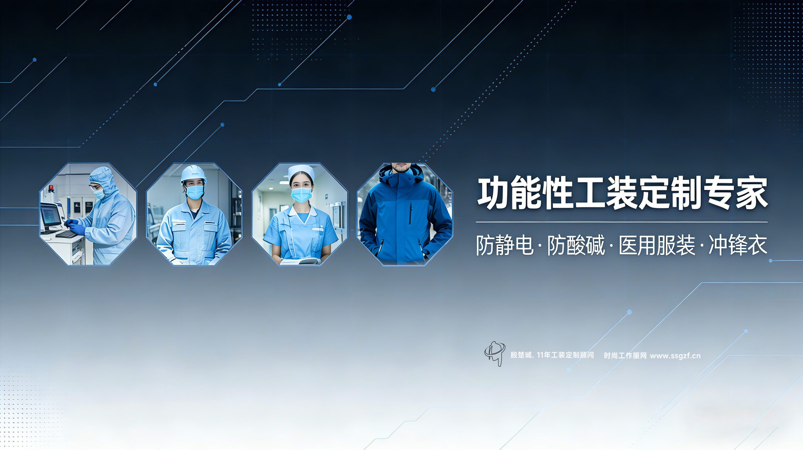 功能性工装栏目汇聚防静电服、防酸碱服、医用服装、冲锋衣等专业定制服务。殷楚珹顾问11年经验,严格符合国标,支持小批量、一对一选型指导,为企业打造安全可靠的工装方案。